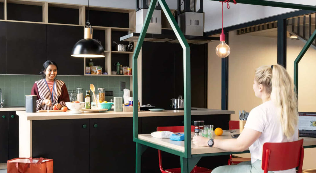 • Salas de estar, áreas de estudo e cozinhas comunitárias construídas especificamente para esse fim em muitas residências